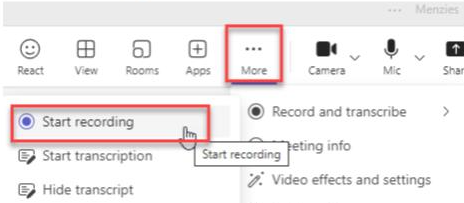To Record and Transcribe a meeting in Teams (which will also generate automated minutes through Menzies automation), use one of the following methods: