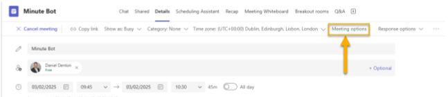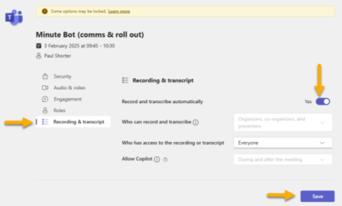Click ‘Meeting options’ (figure 3) and then go to the ‘Recording and transcript’ section and choose to ‘Record and transcribe automatically’ and ensure that you Save (figure 4).