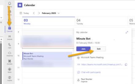 Navigate to the calendar in Teams, click on the required meeting and choose ‘Edit’ (figure 2).